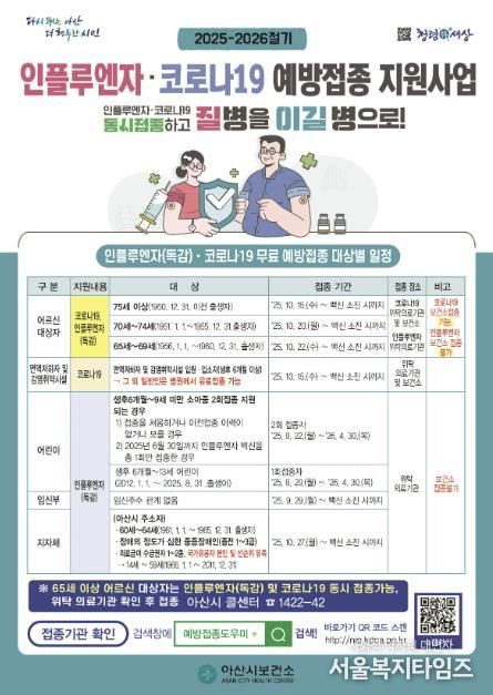 서울복지타임즈 이재연 기자 | 아산시는 10월 15일부터 내년 4월 30일까지 고위험군을 대상으로 무료 코로나19 예방접종을 시행한다.