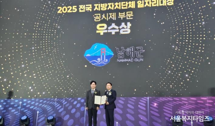 서울복지타임즈 이재연 기자 | 남해군이 9월 30일 청주 오스코에서 열린 고용노동부 주관 ‘2025년 전국 지방자치단체 일자리 대상’ 시상식에서 공시제 분야 우수상을 수상했다. 이번 수상은 2016년 우수상 이후 9년 만에 거둔 성과다.