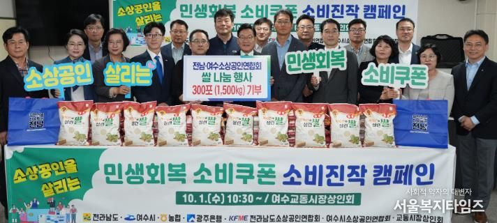 서울복지타임즈 이재연 기자 | 전라남도와 전남도 소상공인연합회는 1일 여수 교동시장에서 농협과 광주은행으로부터 기부받은 쌀(5kg) 300포를 활용해 지역민과 함께 나누는 ‘민생회복 소비쿠폰 소비 진작 캠페인’을 개최했다고 밝혔다.