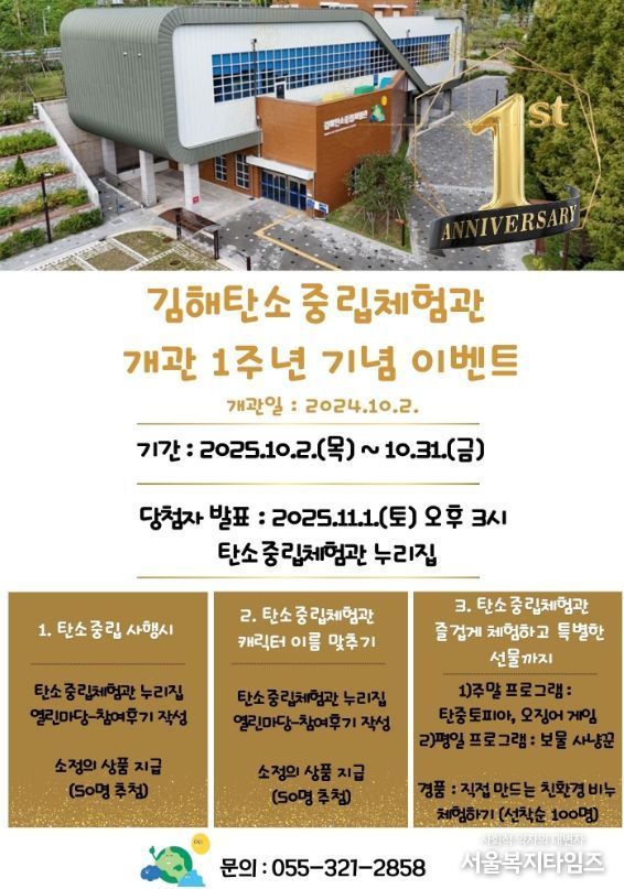 서울복지타임즈 이재연 기자 | 김해시는 김해탄소중립체험관 개관 1주년을 맞아 2일부터 31일까지 한 달간 특별 기념 이벤트를 운영한다. 이번 이벤트는 온라인과 오프라인 어디든 자유롭게 참여할 수 있다.