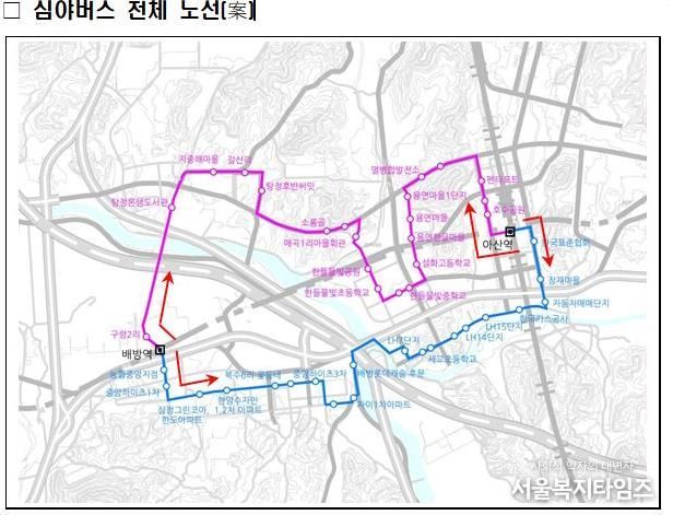 서울복지타임즈 이재연 기자 | 아산시가 심야시간대 시민들의 이동 불편을 해소하고 안전한 귀가를 지원하기 위해 오는 20일부터 배방·탕정지역에 심야버스를 시범 운행한다.