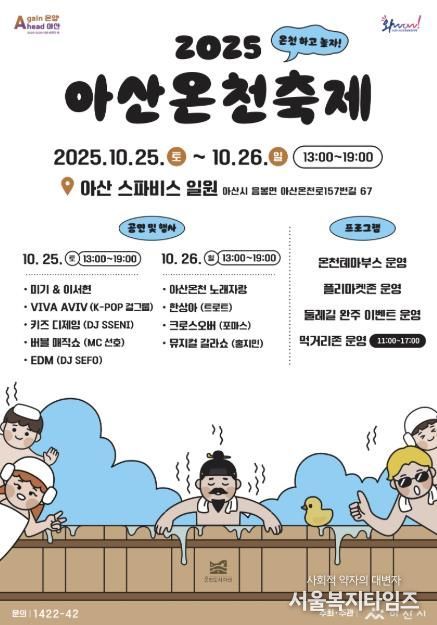 서울복지타임즈 이재연 기자 | 아산시가 주최하는 ‘2025 아산온천축제’가 오는 10월 25일부터, 26일까지 이틀간 아산스파비스 일원에서 열린다.