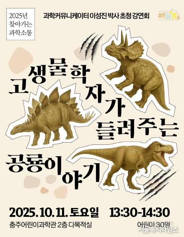 서울복지타임즈 이재연 기자 | 충주어린이과학관은 오는 10월 11일, 과학커뮤니케이터로 활동 중인 고생물학자 이성진 박사를 초청해 초등 저학년 어린이를 위한 특별 강연 ‘고생물학자가 들려주는 공룡 이야기’를 개최한다고 밝혔다.