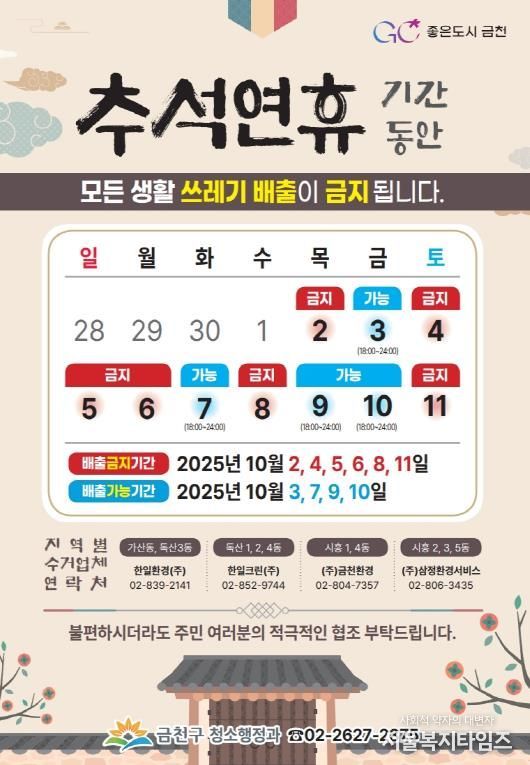 서울복지타임즈 이재연 기자 | 금천구는 추석 연휴 기간 생활쓰레기(일반생활쓰레기, 음식물쓰레기, 재활용품) 수거를 일시 중단한다고 밝혔다.