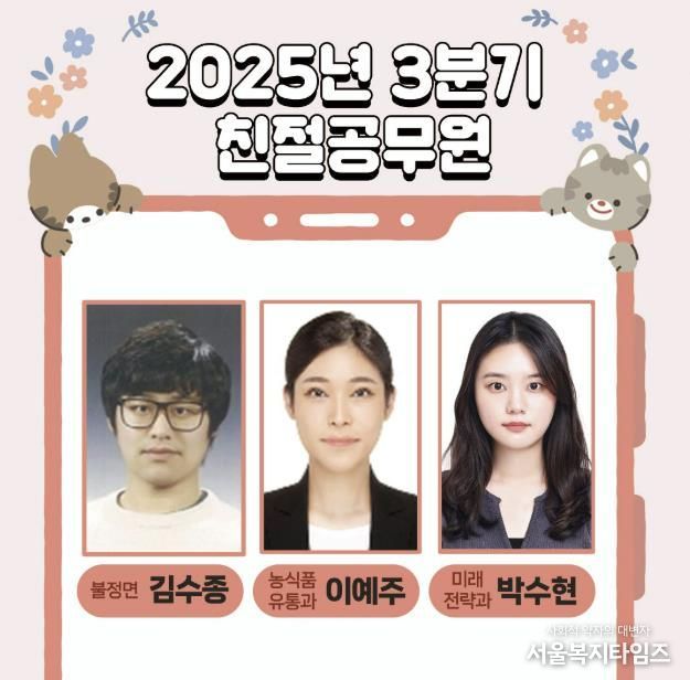 서울복지타임즈 이재연 기자 | 충북 괴산군은 2025년 3분기 친절공무원으로 김수종 주무관(불정면사무소), 이예주 주무관(농식품유통과), 박수현 주무관(미래전략과)을 선정했다고 밝혔다.