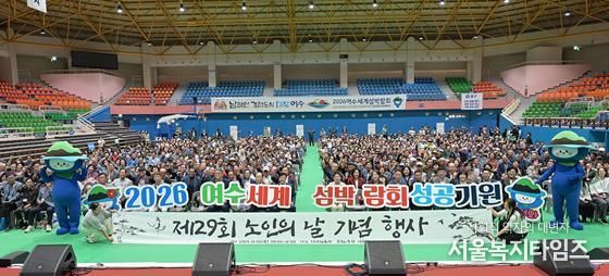 특히 2026여수세계섬박람회 성공개최를 응원하는 퍼포먼스가 진행돼 행사장에 모인 어르신과 내빈이 함께 섬박람회 성공을 기원하며 힘찬 구호를 외쳤다.