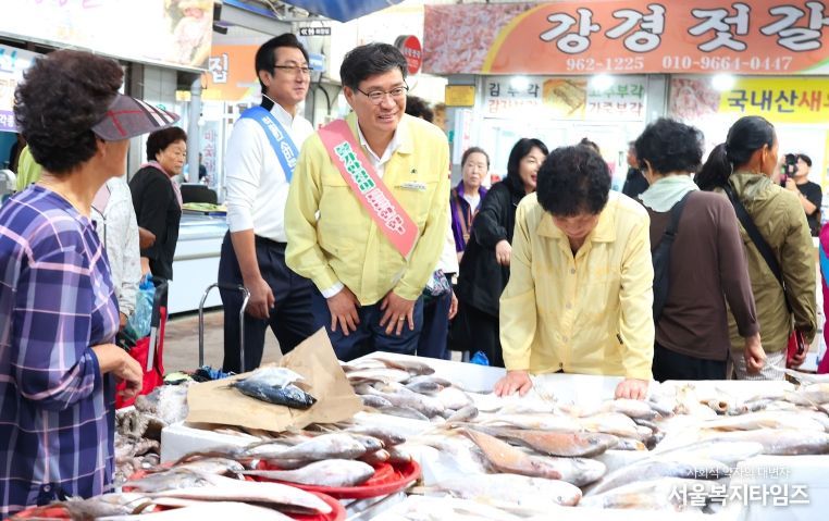 이날 진 군수는 시장 내 제수와 생활필수품 가격을 세심히 확인하며 상인들의 애로사항을 청취했다. 또한 장을 보러 나온 군민들과 일일이 인사를 나누며 전통시장 이용을 독려하고 추석 인사를 전했다.