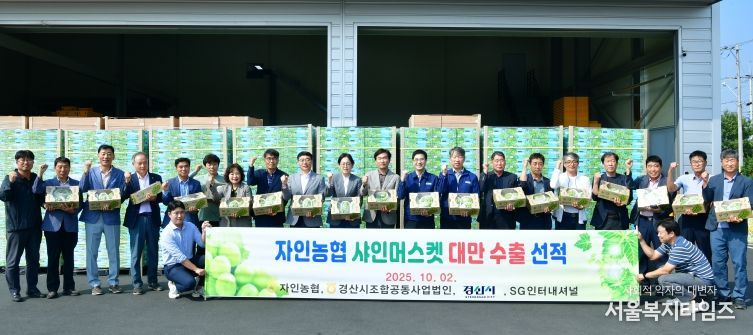 서울복지타임즈 이재연 기자 | 경산시는 2일 자인농협 농산물유통센터에서 조현일 경산시장, 조지연 국회의원, 손병한 자인농협장, 포도 공선회원을 비롯한 관계자 30여 명이 참석한 가운데 대만 수출 선적식을 개최했다.