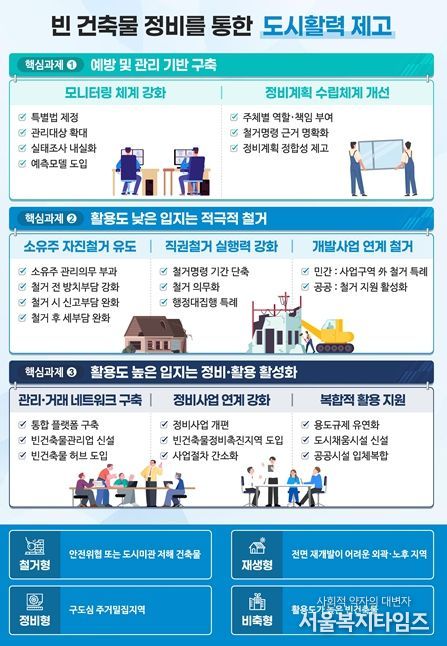 이에, 국토부는 ➊예방 및 관리 기반 구축, ➋활용도 낮은 빈 건축물의 적극적 철거, ➌활용도 높은 빈 건축물의 정비·활용 활성화 등 빈 건축물의 입체적 정비방안을 마련했다.