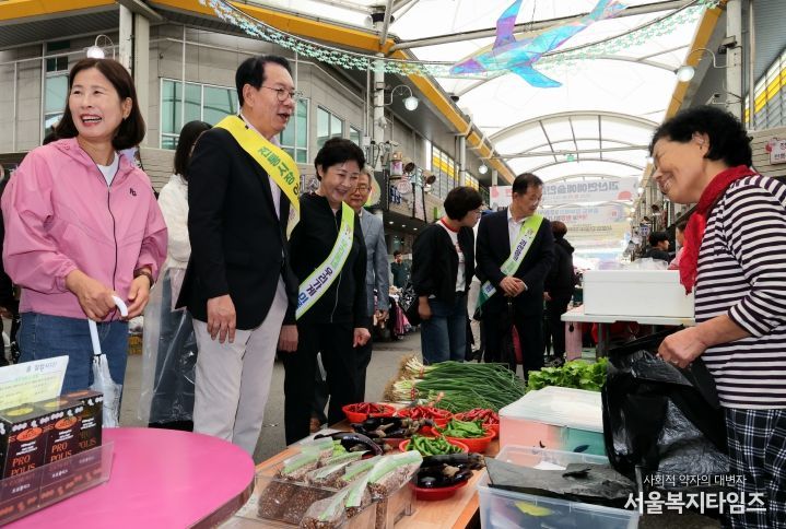 서울복지타임즈 이재연 기자 | 송인헌 충북 괴산군수가 추석을 앞두고 괴산전통시장을 찾아 상인들과 인사를 나누고 직접 장보기에 나섰다.