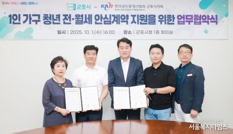 서울복지타임즈 이재연 기자 | 군포시는 10월 1일 시청 1층 회의실에서 한국공인중개사협회 군포시지회와 청년 1인 가구 전월세 안심계약 지원을 위한 업무협약을 체결했다.