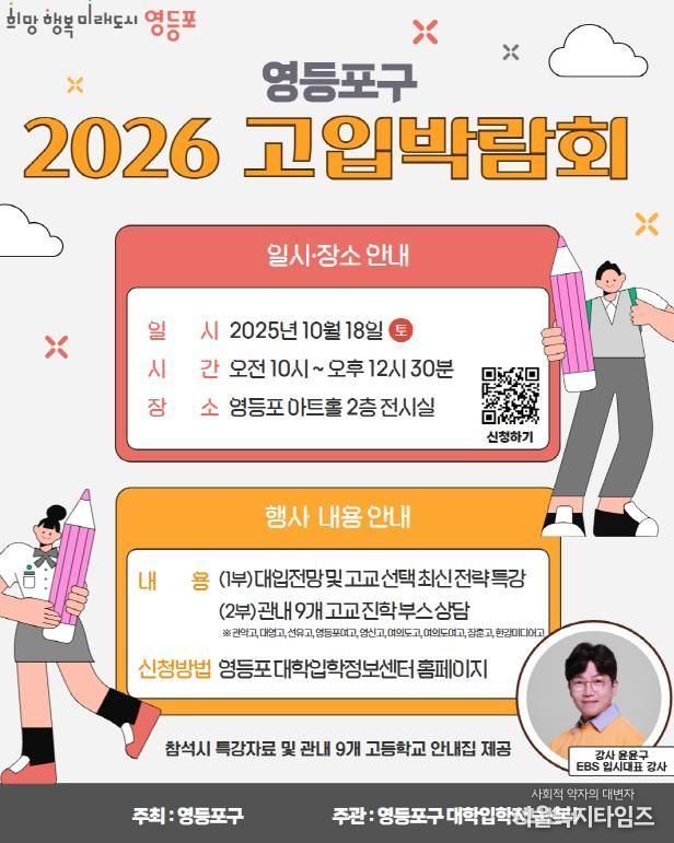 아울러 오는 11월 22일 영등포 아트홀에서는 ‘2026 대입 정시 지원전략 설명회’를 개최할 예정이다. 행사와 관련한 자세한 사항은 ‘영등포 대학입학센터’ 또는 구청 미래교육과로 문의하면 된다.