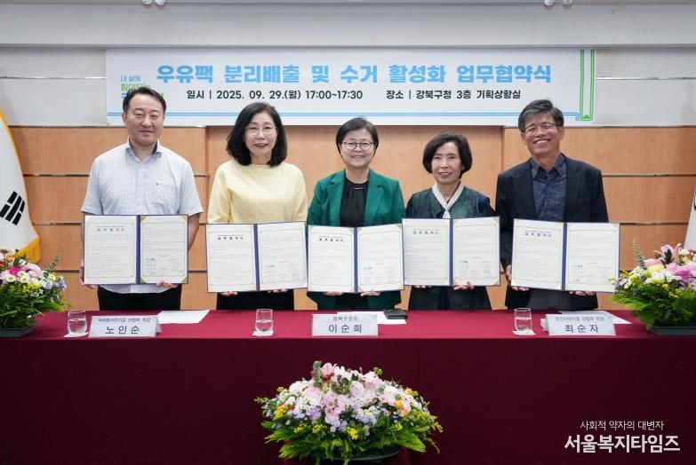 서울복지타임즈 이재연 기자 | 서울 강북구는 9월 29일(월) 구청 기획상황실에서 강북구어린이집연합회와 어진이마을관리 사회적협동조합과 함께 우유팩 분리배출 및 수거 활성화 기반 구축을 위한 업무협약을 체결했다고 밝혔다.