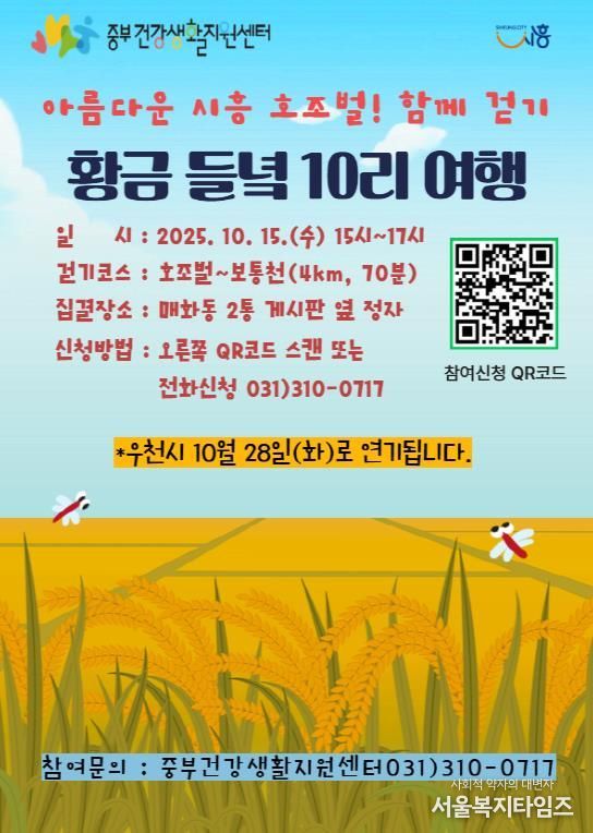 서울복지타임즈 이재연 기자 | 시흥시는 오는 10월 15일 오후 3시부터 5시까지 호조벌 일대에서 ‘황금 들녘 10리 여행 걷기 행사’를 연다.