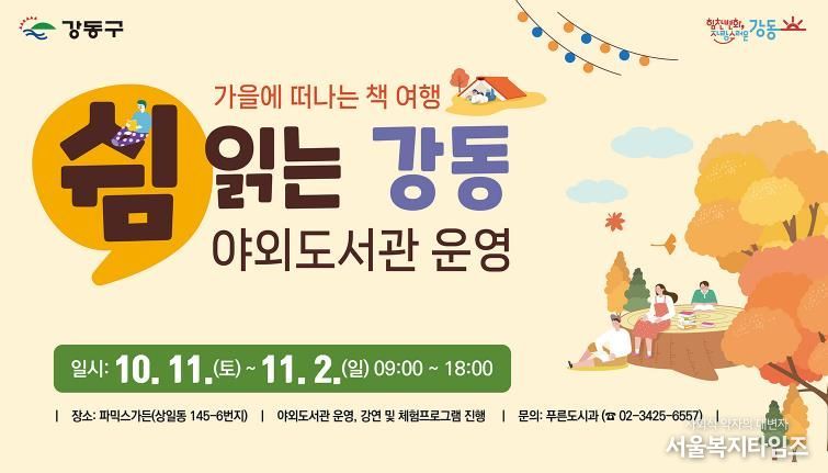 서울복지타임즈 이재연 기자 | 강동구는 10월 11일부터 11월 2일까지 한 달간 파믹스가든(상일동 145-6)에서 주말 야외 도서관 '쉼 읽는 강동'을 운영한다고 밝혔다.