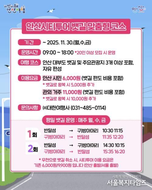 서울복지타임즈 이재연 기자 | 안산시는 오는 11월 30일까지 안산시티투어와 안산-대부도 뱃길 사업을 연계한 ‘안산시티투어 뱃길 맞춤형 코스’ 특별이벤트를 운영한다고 10일 밝혔다.
