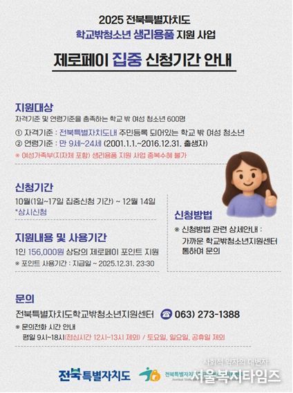서울복지타임즈 이재연 기자 | 전북특별자치도가 경제적 부담을 겪는 학교 밖 여성청소년들을 대상으로 생리용품을 지원하는‘2025년 학교 밖 여성청소년 건강지원사업’을 추진한다.