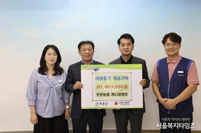 서울복지타임즈 이재연 기자 | 보은농협 하나로마트는 10일 보은군청을 방문해 취약계층을 위해 사용해 달라며 이웃돕기 성금 100만원을 기탁했다.