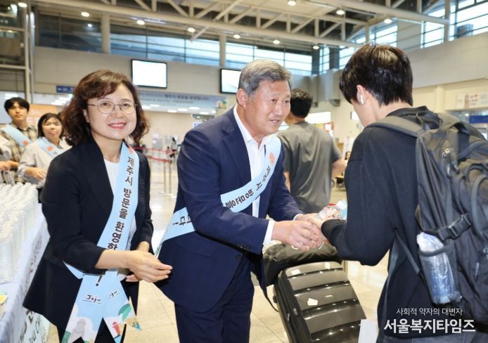 이날 김 시장은 장시간 승선으로 지친 방문객에게 시원한 삼다수를 전달하며 따뜻한 명절 분위기를 조성했고, 제주관광지도와 성안올레지도 등 각종 관광정보를 제공하며 일일이 환영 인사를 전했다.