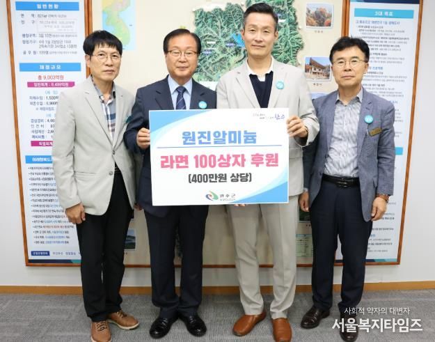 서울복지타임즈 이재연 기자 | ㈜원진알미늄이 완주군에 라면 100상자(환가액 400만 원 상당)를 전달했다.