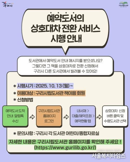 서울복지타임즈 이재연 기자 | 구리시는 오는 10월 13일부터 시민들의 도서 이용 편의성을 높이기 위해‘시립도서관 예약 도서 상호대차 전환 서비스’를 새롭게 운영한다고 밝혔다.