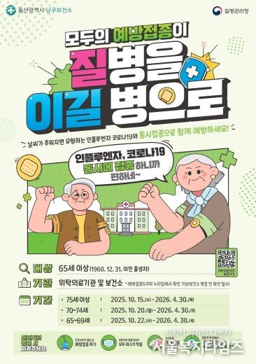 서울복지타임즈 이재연 기자 | 울산 남구보건소는 겨울철 코로나19 유행에 대비해 이번 달 15일부터 65세 이상 어르신을 비롯한 고위험군을 대상으로 무료 예방접종을 실시한다고 밝혔다.