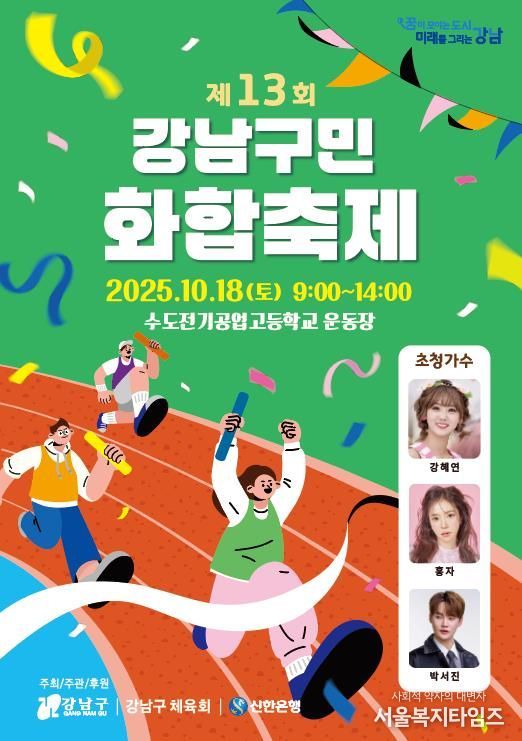 서울복지타임즈 이재연 기자 | 꿈이 모이는 도시, 미래를 그리는 강남구가 오는 10월 18일 오전 9시부터 오후 2시까지 수도전기공업고등학교 운동장에서 ‘제13회 강남구민화합축제’를 개최한다. 구민과 선수단 등 약 7,500명이 참여할 예정이며, 소통과 화합을 바탕으로 건강한 지역사회를 만드는 의미 있는 자리가 될 것으로 기대된다.