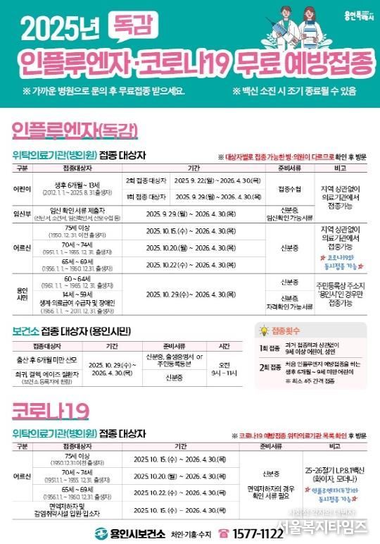 서울복지타임즈 이재연 기자 | 용인특례시는 10월 15일부터 내년 4월 30일까지 지역 내 290개 위탁의료기관에서 코로나19 무료 예방접종을 시작한다고 13일 밝혔다.