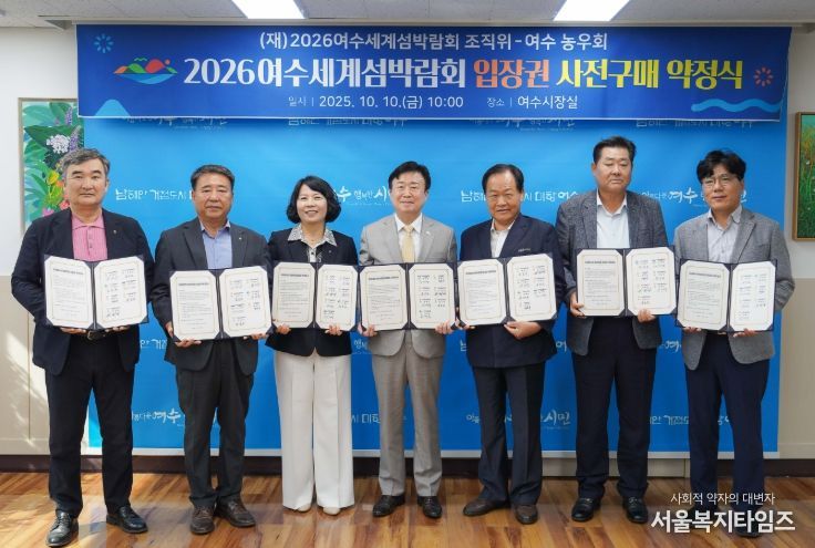 서울복지타임즈 이재연 기자 | (재)2026여수세계섬박람회조직위원회는 지난 10일 여수시청 시장실에서 여수 농우회와 2026여수세계섬박람회 입장권 5,100만 원 규모의 사전 구매 약정을 체결했다고 밝혔다.