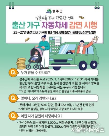 서울복지타임즈 이재연 기자 | 성주군은 13일 올해를 포함해 2027년까지 자녀를 출산한 가구를 대상으로 자동차세를 50%(둘째 자녀 이상 전액) 감면한다고 밝혔다.
