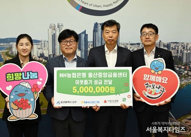 서울복지타임즈 이재연 기자 | NH농협은행 울산본부는 13일 남구청을 방문해 ‘경로의 달’을 기념하여 남구 지역 어르신들의 복지 향상을 위한 후원금 500만 원을 전달했다.