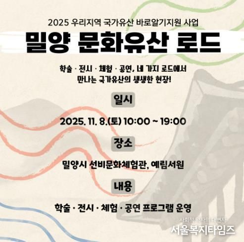 서울복지타임즈 이재연 기자 | 밀양문화관광재단은 오는 11월 8일 오전 10시부터 오후 7시까지 예림서원과 선비문화체험관 일원에서 지역 무형유산의 가치를 시민과 함께 나누는 ‘밀양 문화유산 로드’를 개최한다고 13일 밝혔다.