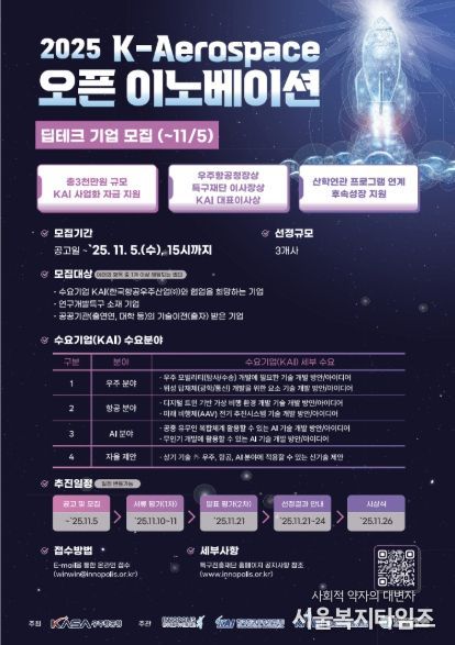 서울복지타임즈 이재연 기자 | 우주항공청은 10월 13일 우주항공청이 주최하고 한국항공우주산업㈜, 연구개발특구진흥재단, 진주강소특구(경상대학교), 한국항공우주연구원이 주관하는 '2025 K-Aerospace 오픈 이노베이션'을 추진하여 딥테크 기업을 육성할 계획이라고 밝혔다.