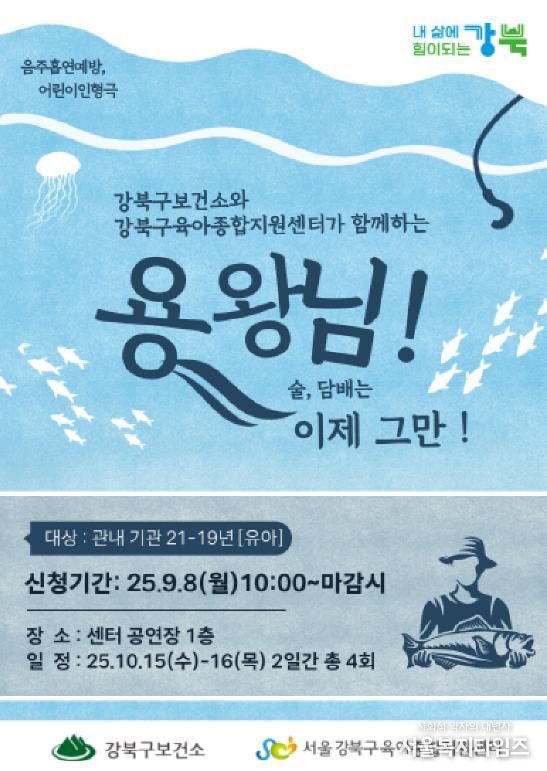 행사는 인수동에 위치한 강북구 육아종합지원센터 1층 공연장에서 진행되며, 오전 10시 20분과 11시 20분 일 2회씩 총 4회 공연으로 구성된다. 인형극 제목은 ‘용왕님 술, 담배는 이제 그만’으로, 술과 담배로 건강을 잃은 용왕님이 자라 경호원과 토끼의 도움으로 금연과 절주의 중요성을 깨닫고 회복하는 이야기다.