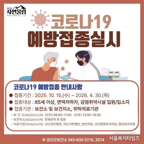서울복지타임즈 이재연 기자 | 충북 괴산군은 2025-2026절기 코로나19 예방접종을 15일부터 실시한다고 밝혔다.
