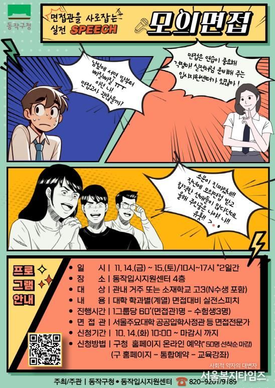 모의 면접은 내달 14~15일 이틀간, 오전 10시부터 오후 5시까지 동작입시지원센터에서 운영된다.