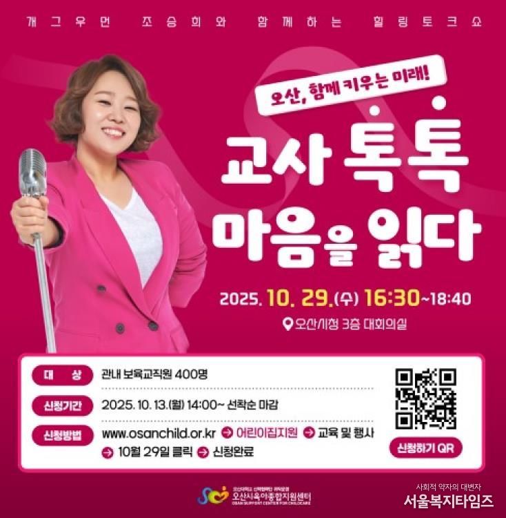 이번 행사는 보육과 육아에 관심 있는 부모 및 보육교직원 누구나 참여할 수 있으며, 선착순 850명까지 무료 입장이 가능하다. 참여 신청은 10월 13일부터 오산시육아종합지원센터 홈페이지를 통해 접수할 수 있다.