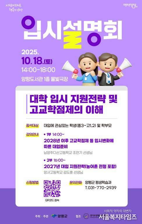 서울복지타임즈 이재연 기자 | 양평군은 오는 10월 18일 오후 2시, 양평도서관 물빛극장에서 관내 학생과 학부모를 대상으로 ‘2025년 양평군 대학 입시설명회’를 개최한다고 밝혔다. 이번 설명회는 대학 입시에 관심 있는 학생과 학부모에게 다양한 입시 정보를 제공하기 위해 마련됐다.
