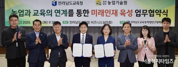 서울복지타임즈 이재연 기자 | 전라남도교육청은 10월 14일 청사 5층 비지니스실에서 전라남도 농업기술원(원장 김행란)과 ‘농업과 교육의 연계를 통한 미래인재 육성 업무협약’을 체결했다.
