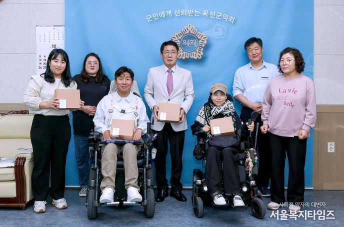 서울복지타임즈 이재연 기자 | 옥천군의회는 지난 14일 의장 집무실에서 충북형 최중증장애인 권리중심일자리 사업 참여자들이 직접 제작한 굿즈를 전달받는 자리를 가졌다.