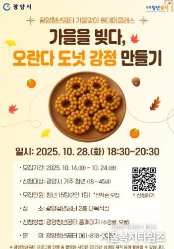 서울복지타임즈 이재연 기자 | 광양시는 청년들의 여가문화 활성화와 정서적 힐링을 위한 프로그램의 일환으로, 광양청년꿈터에서 가을맞이 원데이클래스 ‘가을을 빚다 – 오란다 도넛 강정 만들기’ 참가자를 모집한다고 14일 밝혔다.
