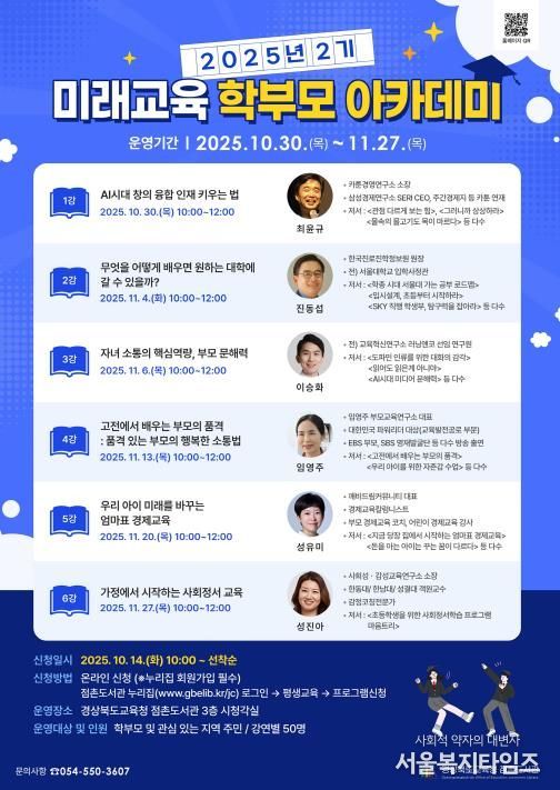 서울복지타임즈 이재연 기자 | 경상북도교육청 점촌도서관은 10월 30일부터 11월 27일까지 학부모 및 일반인을 대상으로 2025년 2기'미래교육 학부모 아카데미'를 운영한다.