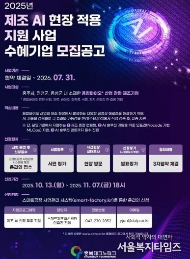 서울복지타임즈 이재연 기자 | 충북도는 오는 11월 7일까지 도내 주력산업인 융합바이오 산업과 인공지능(AI) 기술의 융합 촉진을 위한 ‘제조 AI 현장 적용 지원사업’의 참여기업을 모집한다고 14일 밝혔다.