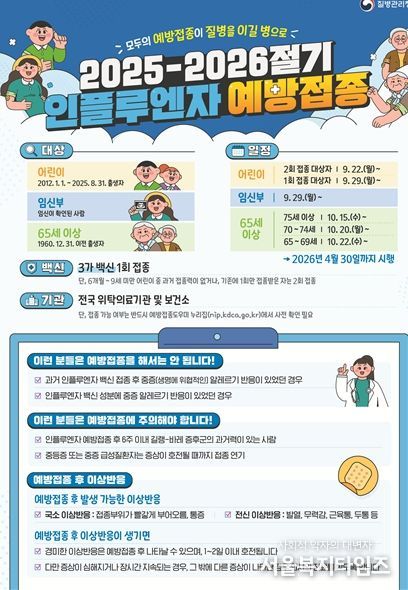 서울복지타임즈 이재연 기자 | 질병관리청은 10월 15일부터 65세 이상 어르신을 대상으로 ’25-’26절기 인플루엔자 예, 방접종을 실시하고, 코로나19 고위험군(65세 이상, 면역저하자 등)을 대상으로 ’25-’26절기 코로나19 예방접종을 실시한다.