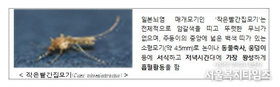 일본뇌염 매개모기인 작은빨간집모기는 암갈색 소형 모기로 주로 야간에 흡혈활동을 하고, 우리나라 전 지역에서 10월까지 활동하는 것으로 관찰된다. 일본뇌염 매개모기 감시 결과 9월말 기준(39주차) 평균 108개체로 지속적으로 발생하고 있으므로, 모기 물림에 주의하고, 증상 발현 시 신속하게 의료기관을 방문하여 진단 및 치료를 받아야 한다.