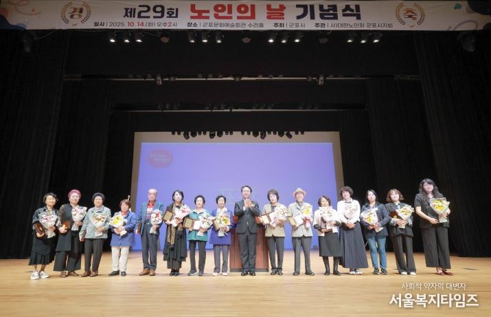 서울복지타임즈 이재연 기자 | 군포시는 10월 14일 (사)대한노인회 군포시지회 주관으로 군포문화예술회관 수리홀에서 ‘제29회 노인의 날’ 기념식을 개최했다.