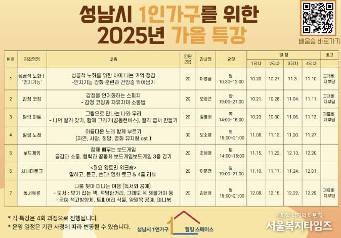 서울복지타임즈 이재연 기자 | 성남시는 오는 10월 20일부터 12월 29일까지 중원구 하대원동 1인 가구 힐링스페이스에서 총 150명이 참여하는 7개 과목(과목별 20~30명)의 특강을 연다.