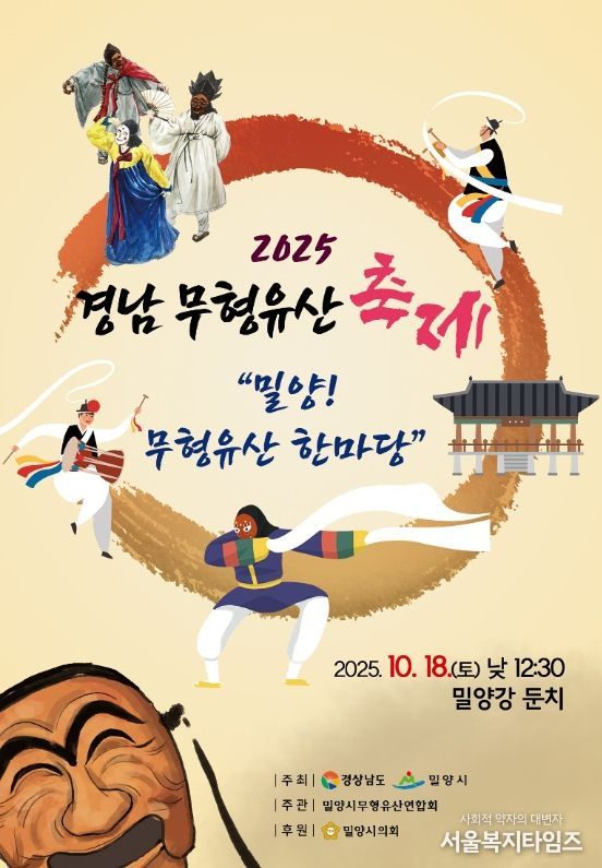 서울복지타임즈 이재연 기자 | 경남 밀양시는 오는 18일 오후 12시 30분, 삼문동 밀양강변 둔치 일원에서 경상남도와 밀양시가 주최하고, 밀양시무형유산연합회(회장 이용만)가 주관하는 ‘경상남도 무형유산축제’를 개최한다고 15일 밝혔다.