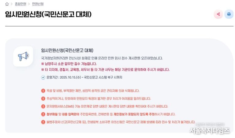 서울복지타임즈 이재연 기자 | 남양주시는 지난 9월 26일 국가정보자원관리원 화재로 국민신문고 시스템이 중단된 가운데, 시민 불편을 줄이기 위해 시 홈페이지에 임시 민원 접수 창구를 마련해 10월 15일부터 운영하고 있다고 밝혔다.