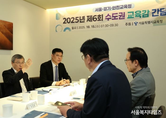 서울복지타임즈 이재연 기자 | 서울특별시교육청 정근식 교육감은 경기도교육청 임태희 교육감,인천광역시교육청 도성훈 교육감과 함께 10월 15일 수도권교육감 간담회를 열고, 21대 정부의 국정과제 실현을 위한 교육제도 개선 방향과 학생의 학습권·인권 보장 및 안전확보를 위한 정책 대응 방안을 논의했다.